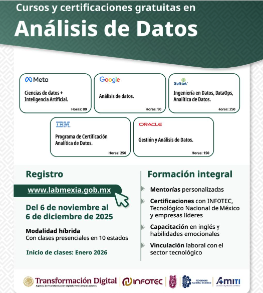 El mundo funciona con datos, y la habilidad para interpretarlos se ha convertido en la superpotencia del siglo XXI. Si estás buscando dar un giro a tu carrera profesional o profundizar en un campo con alta demanda laboral, has llegado al lugar correcto. Hablamos de los cursos de análisis de datos, pero no de cualquiera: te presentamos una iniciativa única del Gobierno de México que ofrece formación especializada, mentorías y dobles certificaciones… y lo mejor de todo, es completamente gratuita.