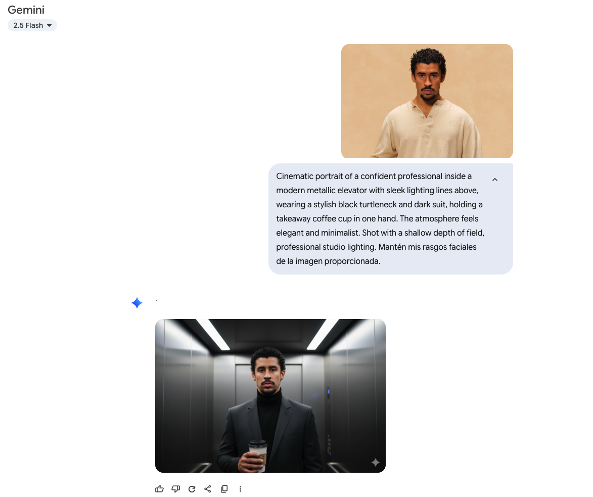 - Prompt para un look ejecutivo y moderno:“Cinematic portrait of a confident professional inside a modern metallic elevator with sleek lighting lines above, wearing a stylish black turtleneck and dark suit, holding a takeaway coffee cup in one hand. The atmosphere feels elegant and minimalist. Shot with a shallow depth of field, professional studio lighting. Mantén mis rasgos faciales de la imagen proporcionada.”