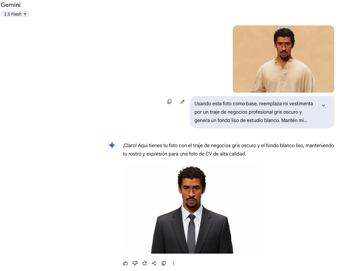 - Prompt para un look conservador de profesionista: “Usando esta foto como base, reemplaza mi vestimenta por un traje de negocios profesional gris oscuro y genera un fondo liso de estudio blanco. Mantén mi rostro y expresión. Foto de CV, alta calidad y resolución.”