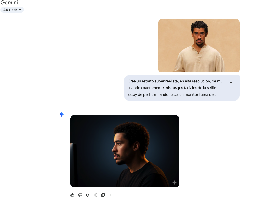 - Prompt para un look creativo y enfocado:“Crea un retrato súper realista, en alta resolución, de mí, usando exactamente mis rasgos faciales de la selfie. Estoy de perfil, mirando hacia un monitor fuera de cámara, con una expresión calmada y concentrada. La iluminación es dramática y cinematográfica, con una luz de fondo cálida que crea un contorno en mi hombro. El fondo es un degradado limpio de azul oscuro a negro. El ambiente general es cinematográfico, audaz y editorial. Ultra nítido, con alto realismo.”